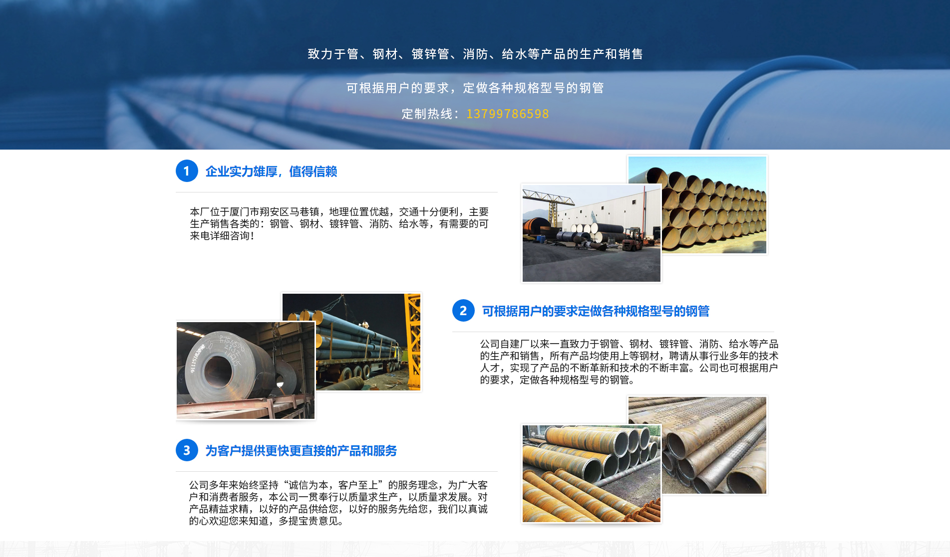 廈門方圓澤金屬材料有限公司主要生產(chǎn)銷售各類銀澤的:鋼管、鋼材、鍍鋅管、消防、給水等,產(chǎn)品被廣泛應(yīng)用于天然氣、石油、化工、電力、熱力管網(wǎng)、水源等長(zhǎng)距離輸送管道等,公司建立起了產(chǎn)品售前、售后服務(wù)規(guī)范,全過程滿足顧客要求,使我們的產(chǎn)品和服務(wù)深得顧客的信賴,與顧客建立起了長(zhǎng)期合作互利關(guān)系。